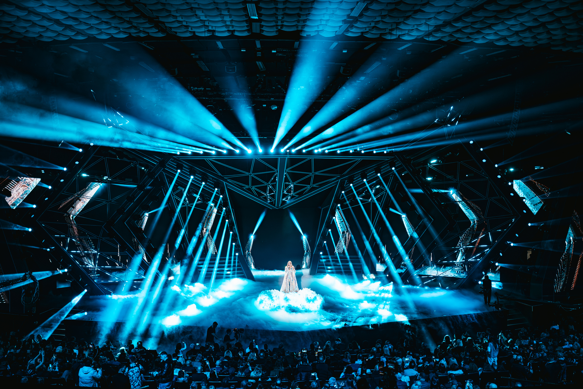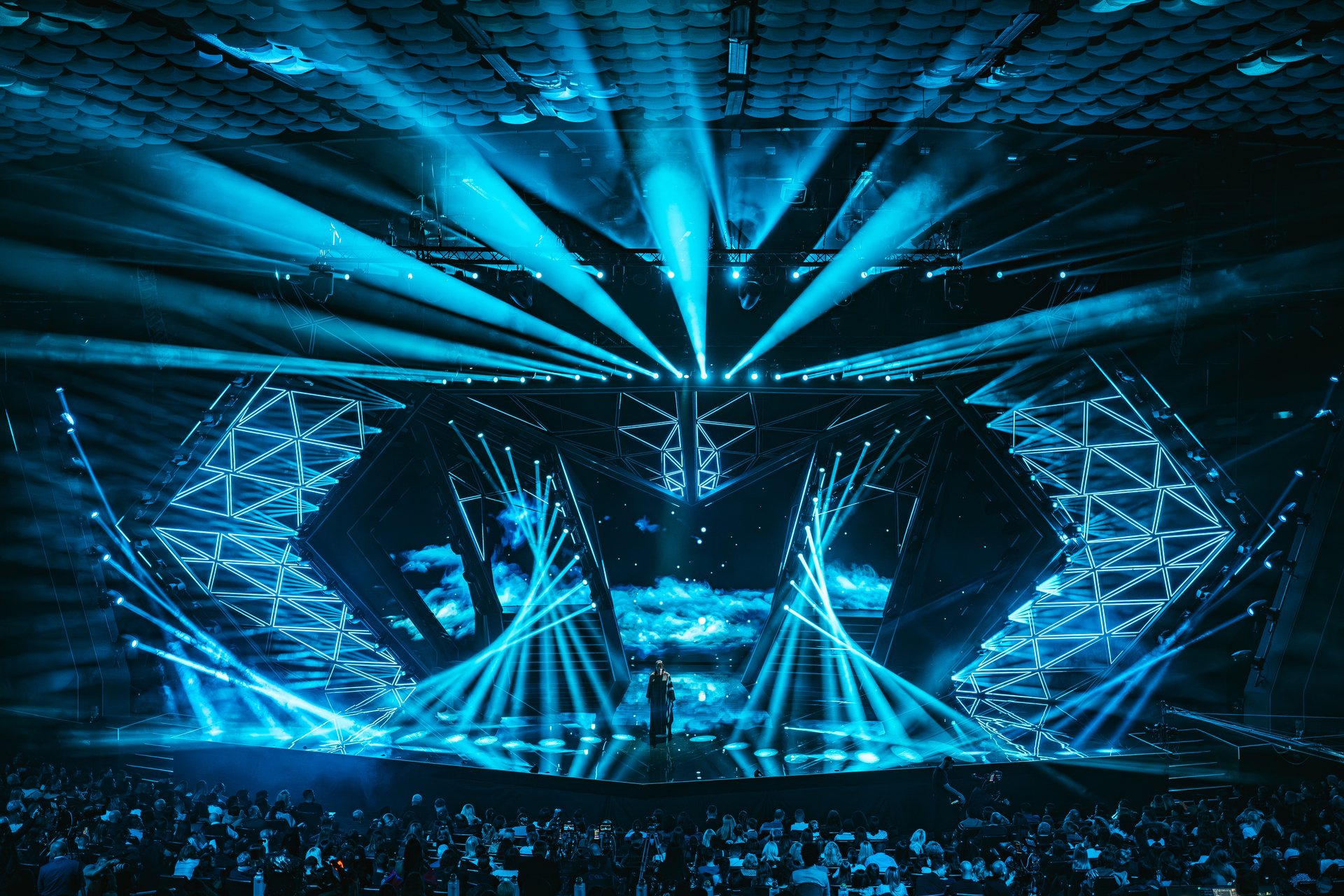 Il lighting design si è integrato perfettamente nella scenografia definita da elementi grafici e costruita attorno a grandi forme geometriche e luminose che hanno definito la scena. Per ottenere l'impatto visivo che ha caratterizzato la produzione, l'illuminazione del palco è stata ulteriormente arricchita da 50 sagomatori EclProfile FS, 60 Stark 400, un wash LED con zoom lineare e controllo pixel, 25 barre LED Lumipix 15IP e 20 LumiPix 12UQPRO.