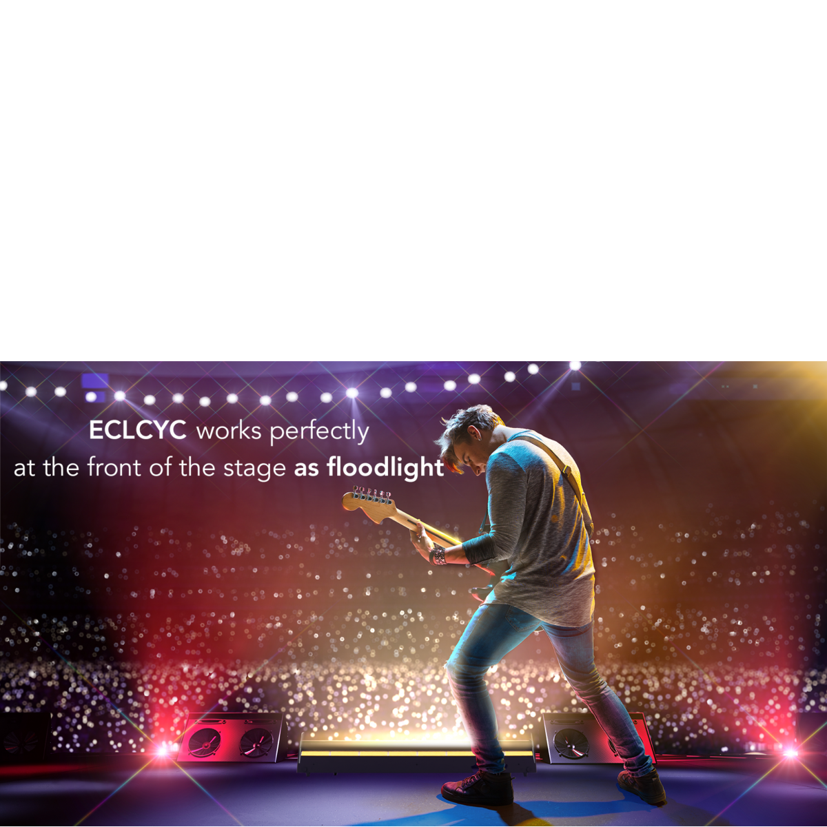 EclCyclorama 100 è un proiettore lineare con ottica soft-edge per applicazioni come CYC o floodlight, progettato in un form factor sorprendentemente sottile per essere applicato sia sul fronte che sul retro di un palco, ed allo stesso tempo offrire un livello di luminosità senza precedenti nella sua categoria. Il proiettore è dotato di una sorgente LED RGB + WarmWhite custom e calibrata, in grado di fornire una riproduzione di luce bianca bianca lineare e di alta qualità ad ampio spettro con elevate prestazioni CRI, TLCI e TM30. Il sistema ottico è stato progettato per offrire un angolo di proiezione asimmetrico molto ampio e con un'alta efficienza e potenza d'emissione, permettendo ai proiettori della gamma EclCyclorama un'estrema flessibilità, sia per applicazioni in cui i proiettori sono connessi in catena oppure quando separati da una notevole distanza, senza limiti nella sovrapposizione dei fasci, preoccupazioni di eventuali dark-gaps o di omogeneità in proiezione. EclCyclorama è estremamente user-friendly e offre molteplici possibilità di controllo tra cui DMX, RDM, Artnet, sACN e Wireless DMX.