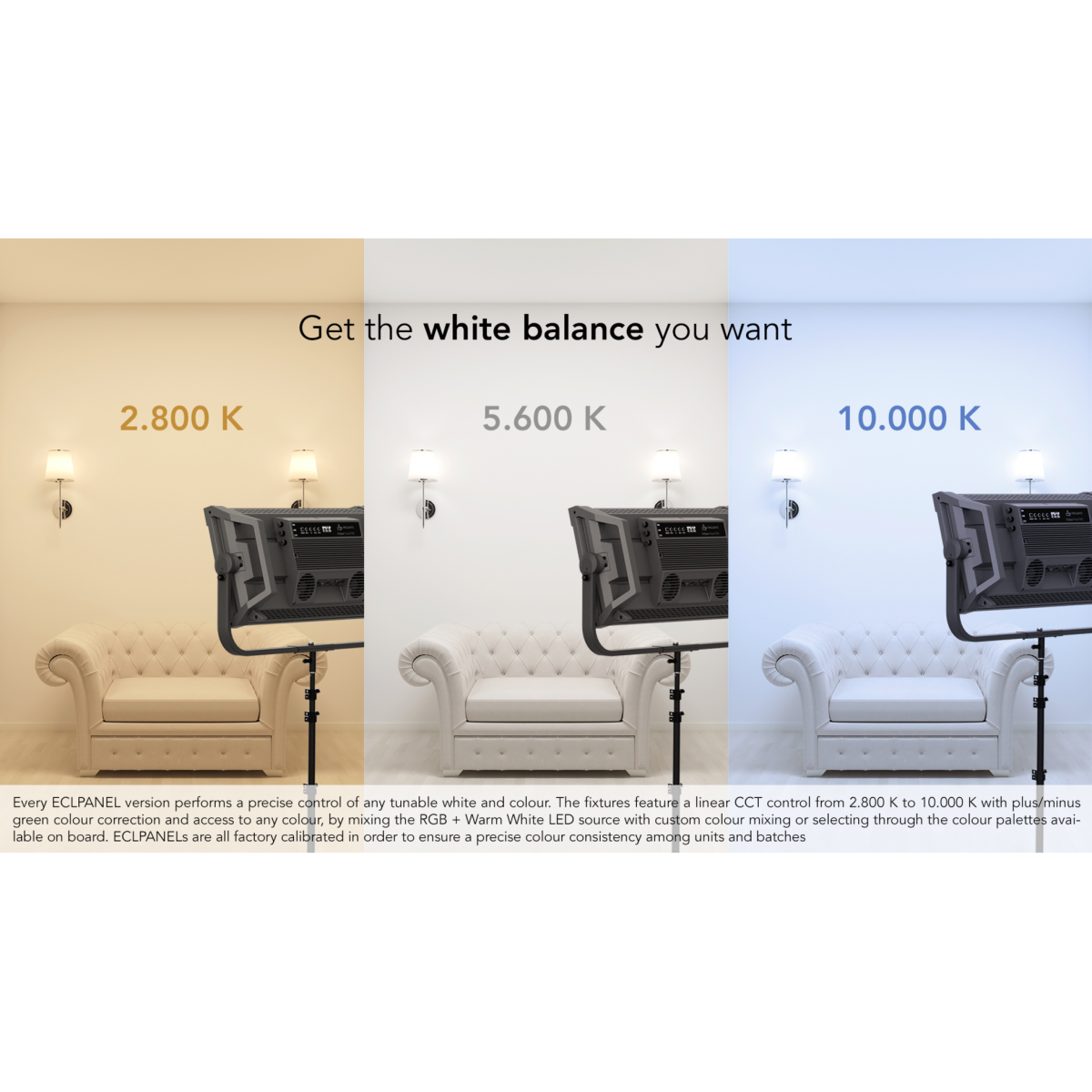 EclPanel TWC è un softlight LED compatto di formato 2x1, concepito per una riproduzione di luce bianca ad altà qualità dalle tonalità Tungsten a Daylight mantenendo un elevato scoring in CRI, TLCI e T...
