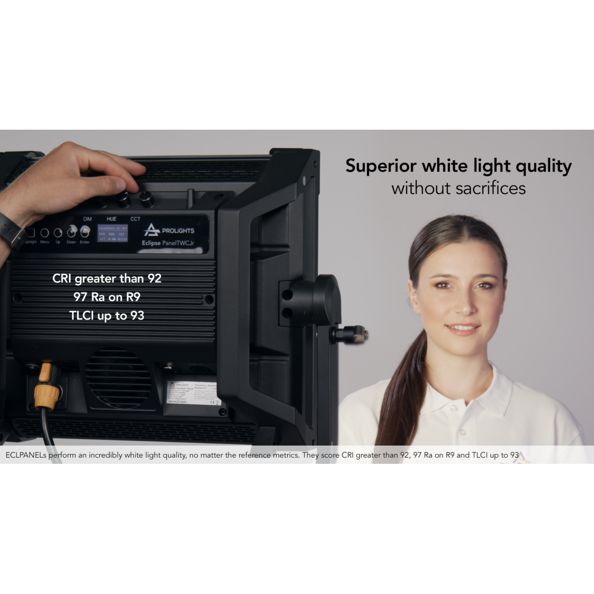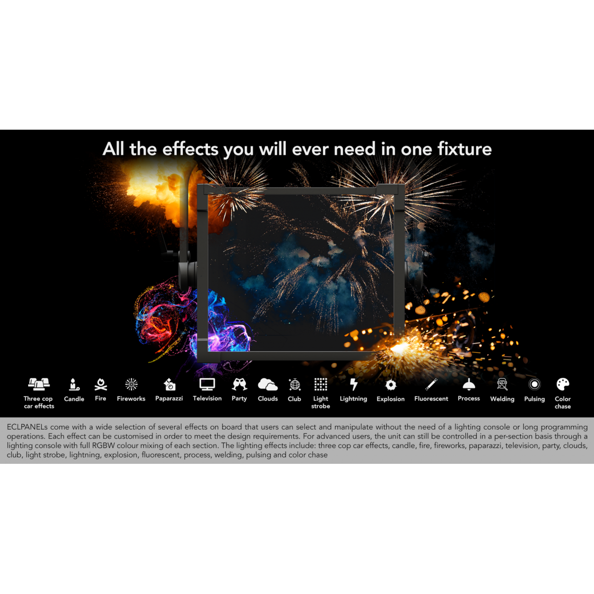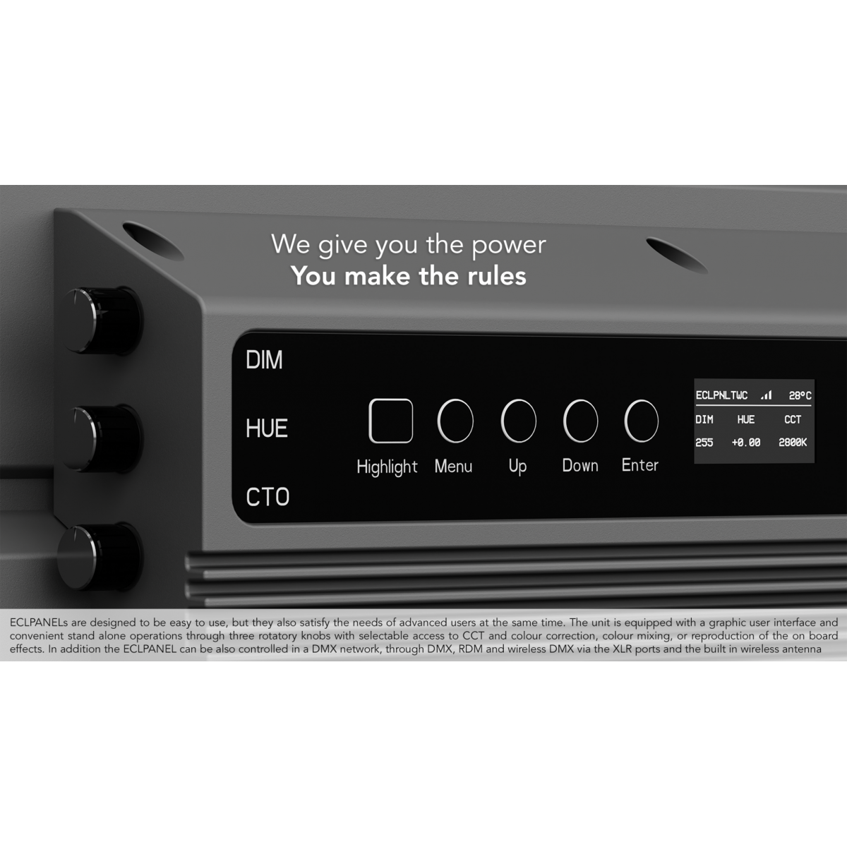 EclPanel TWC è un softlight LED compatto di formato 2x1, concepito per una riproduzione di luce bianca ad altà qualità dalle tonalità Tungsten a Daylight mantenendo un elevato scoring in CRI, TLCI e TM-30, ed allo stesso tempo permette l'accesso ad una gamma cromatica FullSpectrum. EclPanel TWC consente un rapido e preciso controllo anche in modalità Stand Alone attraverso le 3 manopole rotatorie a bordo con tre modalità di funzionamento selezionabili: CCT, con +/- green, HSI per il pieno controllo di colore, saturazione e intensità, FX con accesso agli effetti pixel cinematografici pre-impostati a bordo. L'unità può anche essere controllata in otto sezioni indipendenti, per consentire la riproduzione di effetti personalizzati integrati, o personalizzabili da qualsiasi lighting desk con un ampia scelta di effetti speciali concepiti per applicazioni cinema. Il proiettore è progettato con alimentatore e driver di controllo integrato nell'housing , e la sua semplicità d'uso rende EclPanel un illuminatore ideale per applicazioni in Studio, Cinema o Corporate.