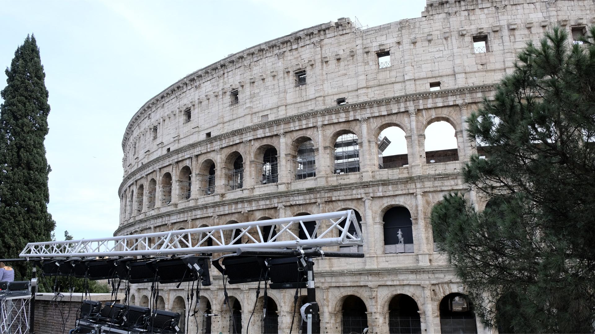 Despite the relatively small setup, the requirements by the production team were demanding: “We absolutely needed a minimum of IP-65 protection on all the fixtures,” added Strolighi, continuing: “We also needed lenses with a 15-25º field angle, and powerful enough to be able to wash the monument with orange colours, uniformly, at a distance of between 70 and 90 metres from the Colosseum. We went for PROLIGHTS as we are used to their fixtures' great performance - we always use their architectural series for fixed and temporary installations, always with great results,” he ended.
