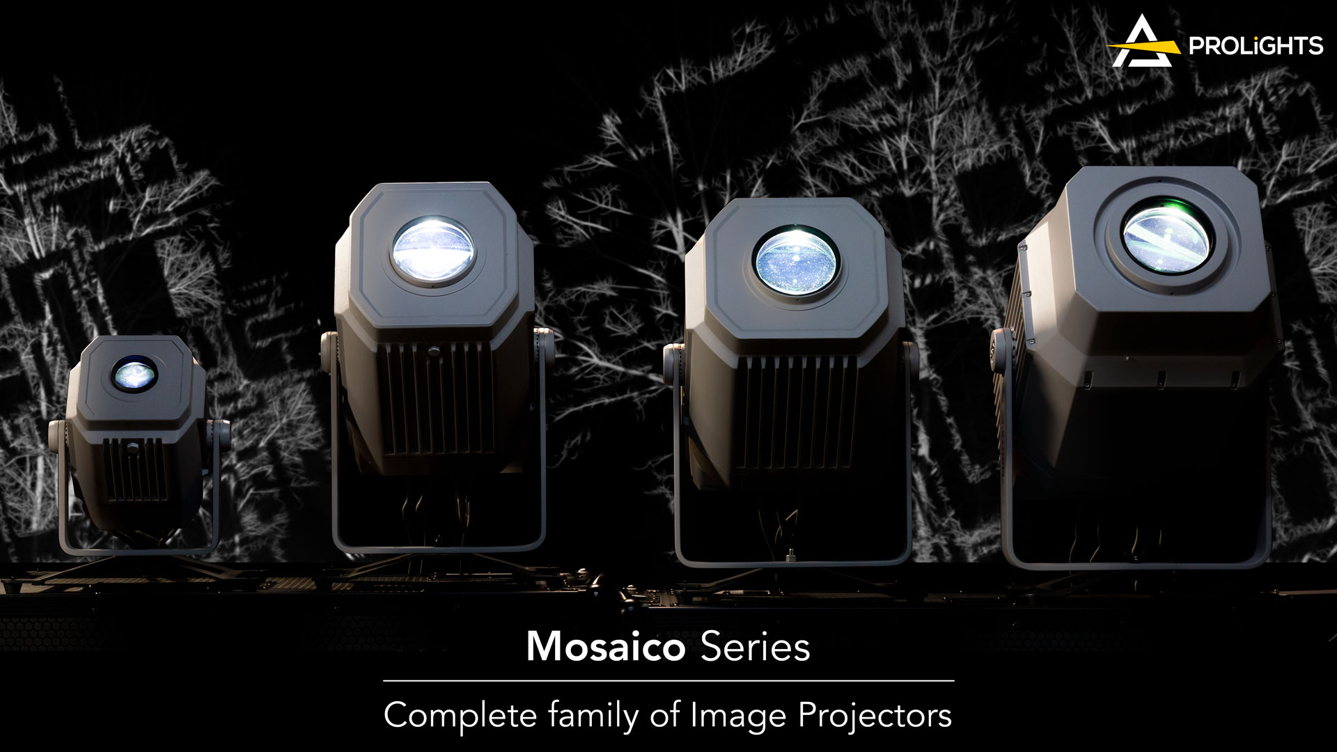 Mosaico L, ampliando la serie di proiettori di immagini Mosaico, i dispositivi LED ideali per proiezioni a lungo raggio di textures, immagini e loghi su edifici e paesaggi.