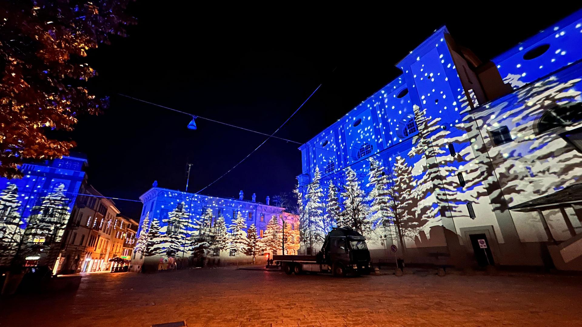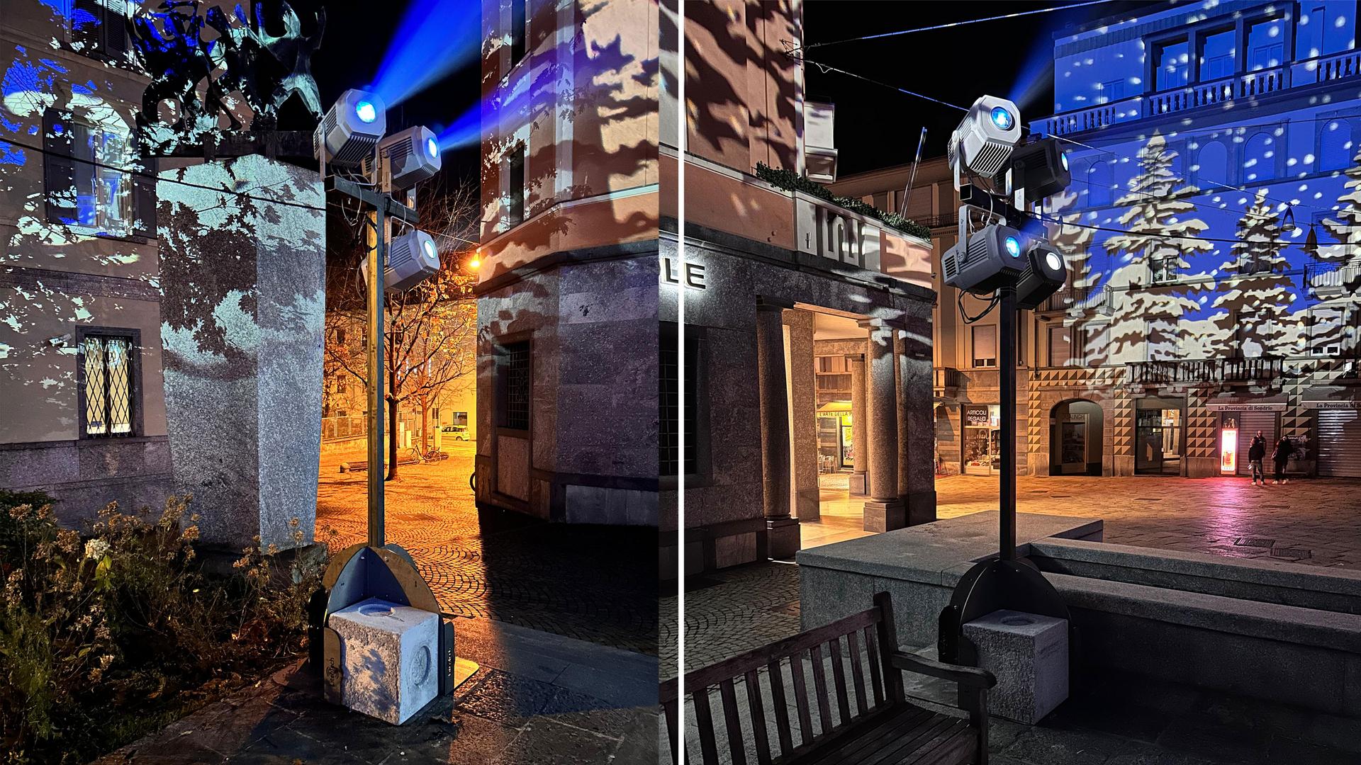 In totale, sono state impiegate 13 unità di proiettori, personalizzati con Gobos e Animation Weels anch'essi realizzati da PROLIGHTS. Questi proiettori multifunzionali per installazioni outdoor sono stati essenziali nel creare un'atmosfera natalizia coinvolgente della principale piazza di Sondrio.