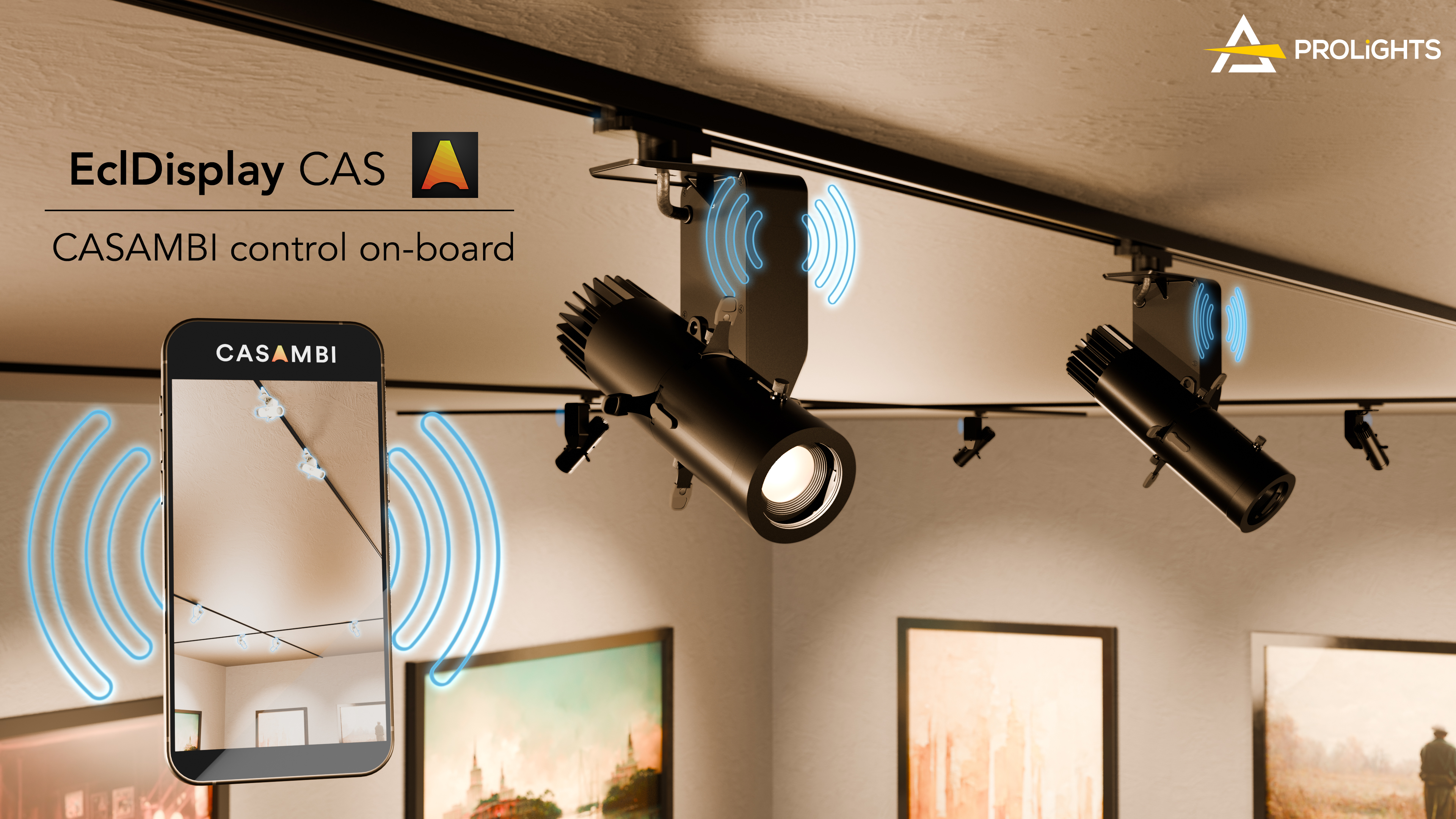 EclDisplay CAS, l'ultima aggiunta della gamma di proiettori per applicazioni gallery EclDisplay con controllo Casambi integrato a bordo.