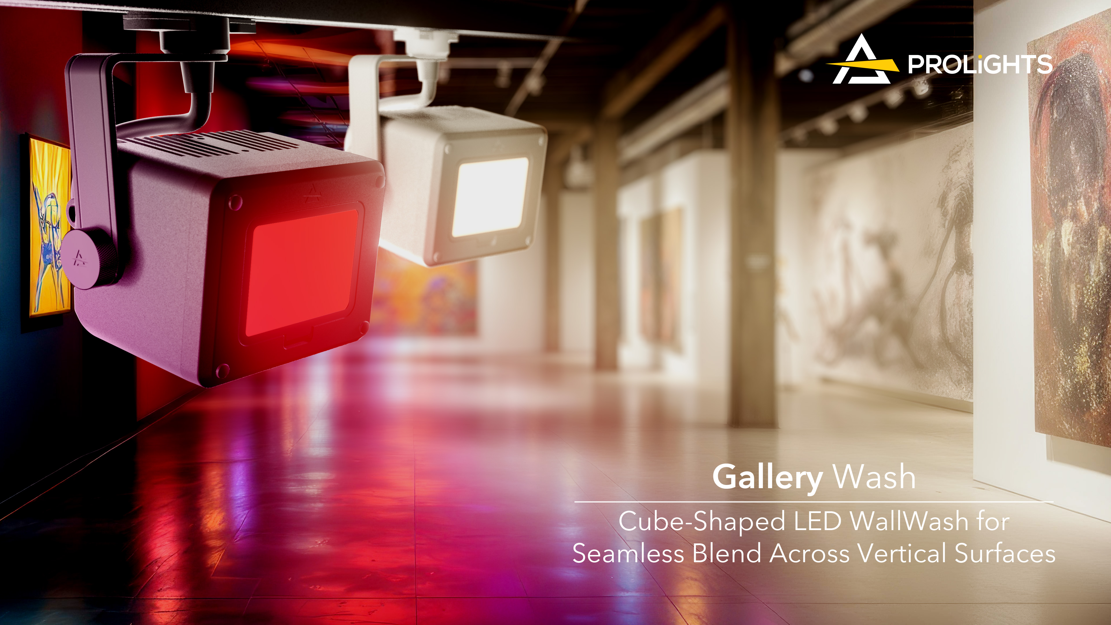PROLIGHTS presenta la serie Gallery Wash, una gamma di LED Wall Wash compatti, sviluppata per un'illuminazione verticale precisa e uniforme in gallerie, showroom e studi televisivi con soffitti bassi. Grazie a una sorgente LED lineare personalizzata abbinata a un riflettore asimmetrico, i proiettori della serie Gallery WashDAT generano effetti di wall-washing omogenei con un numero inferiore di unità, permettendo spaziature maggiori senza sacrificare il comfort visivo e l'uniformità luminosa.