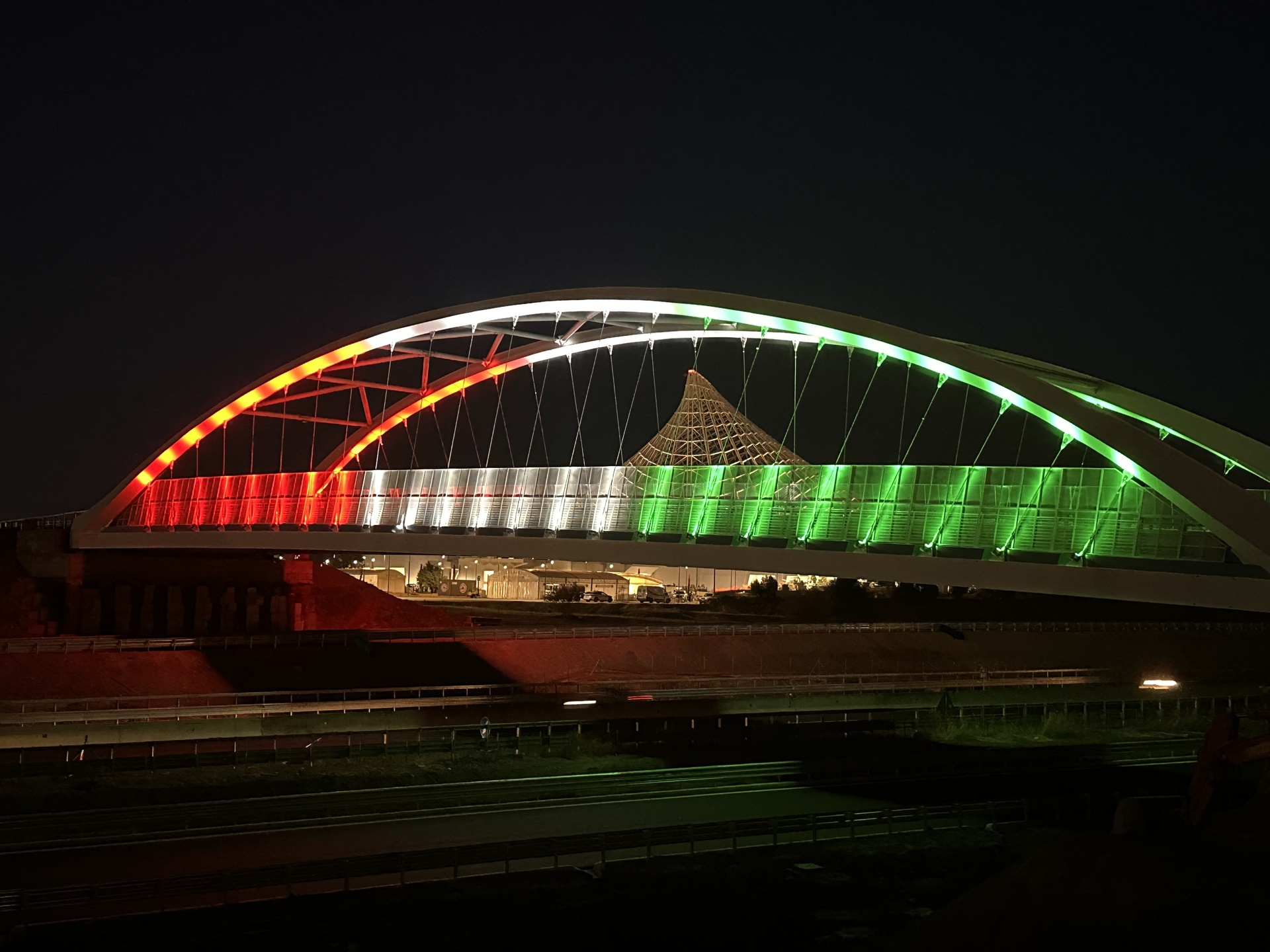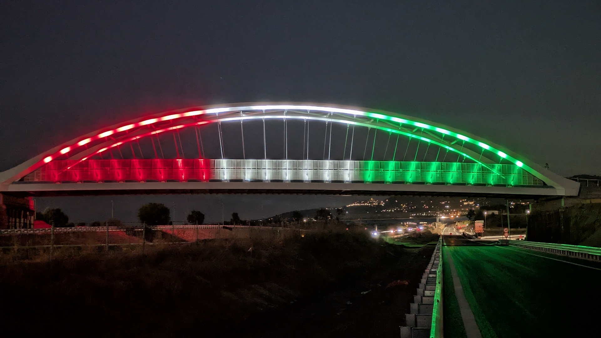 Di notte, il ponte diventa un punto di riferimento luminoso: il fascio uniforme e pulito creato dai proiettori PROLIGHTS valorizza le linee architettoniche e dona vita alla struttura con un impatto visivo di grande effetto.